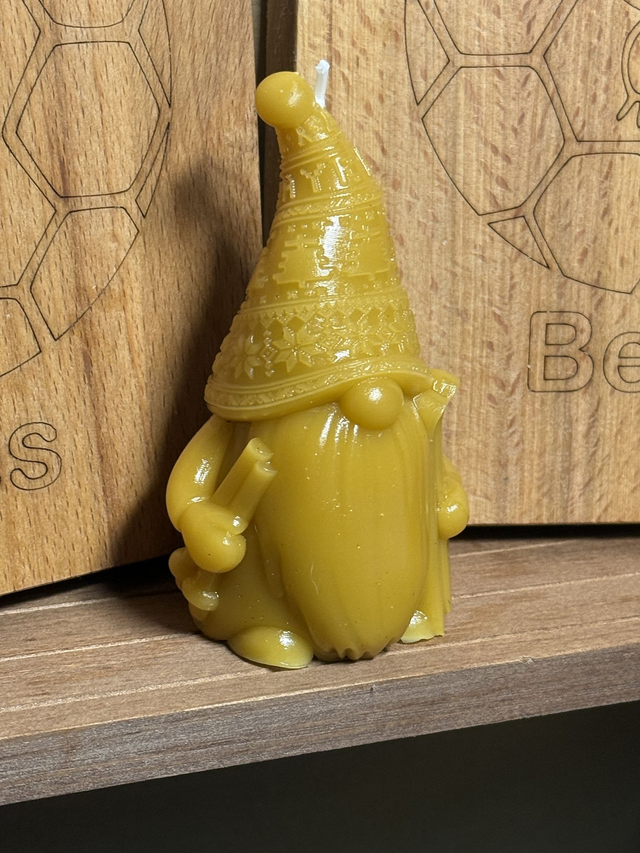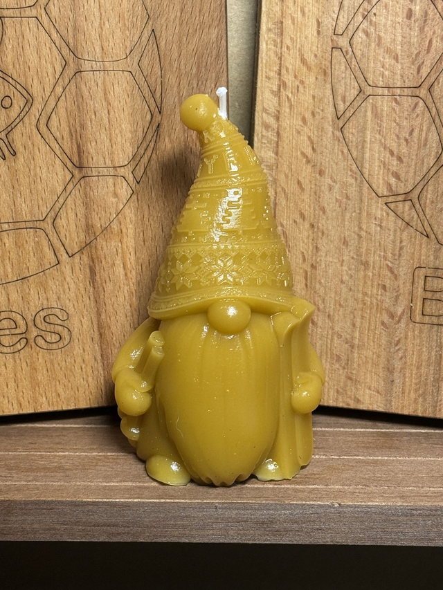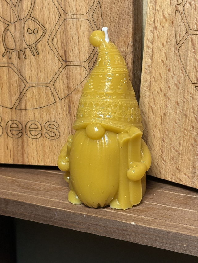 Homemade Beeswax Candle in the shape of a Gonk with Skis