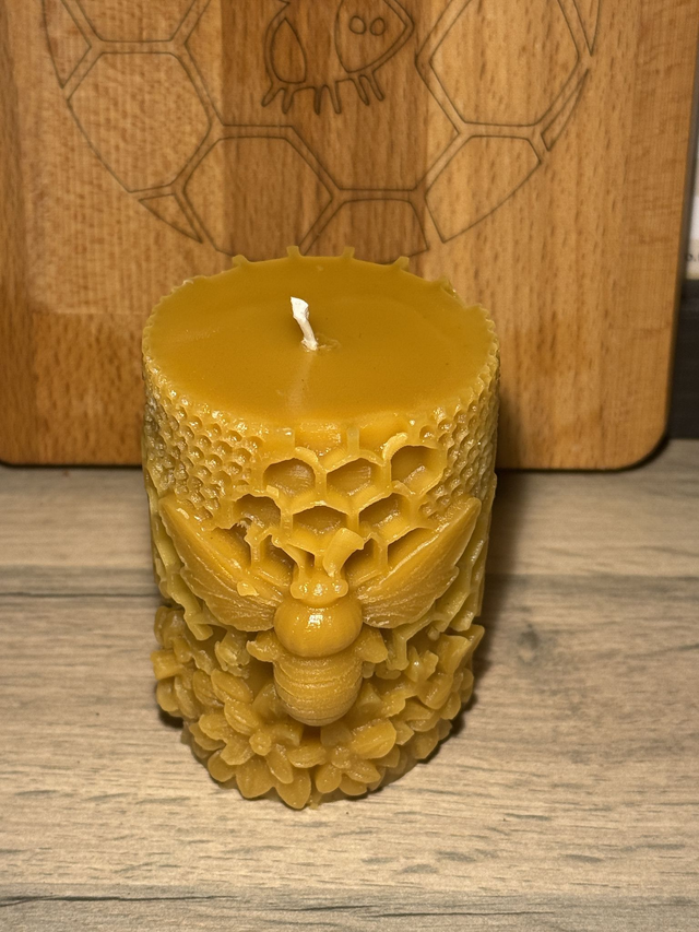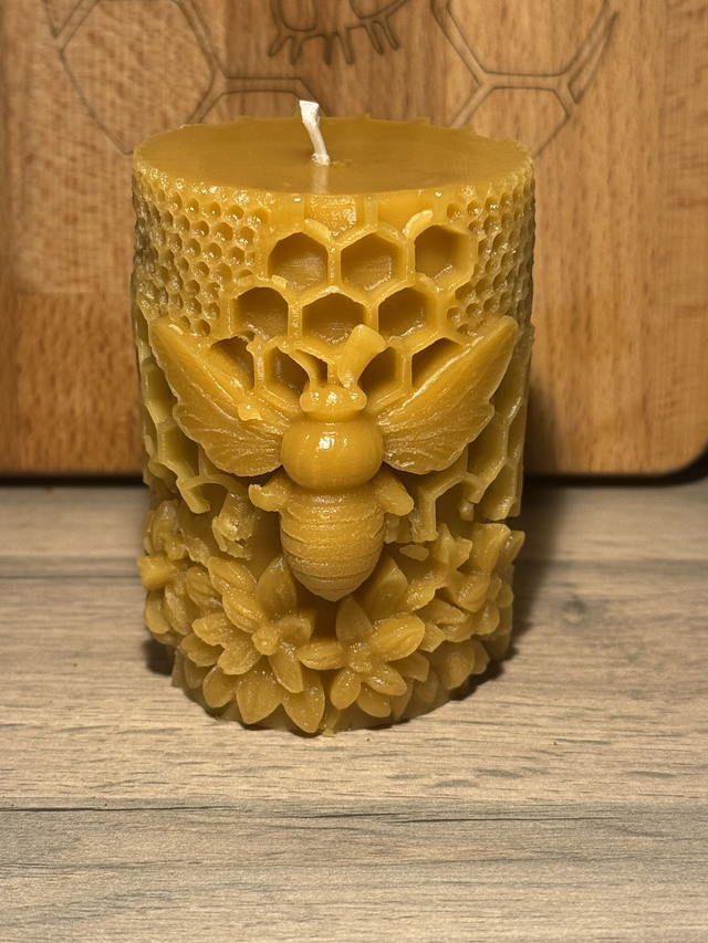 Homemade Beeswax Pillar Candle with a large bee on the front