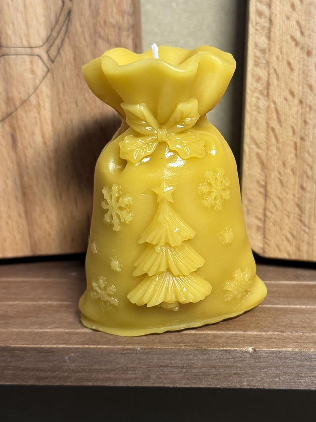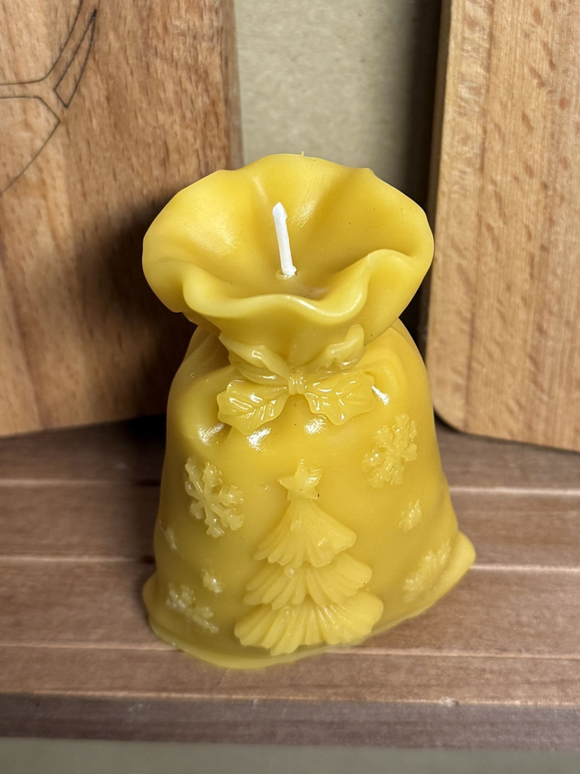 Homemade Beeswax Candle in the shape of a Sack with Tree on Front